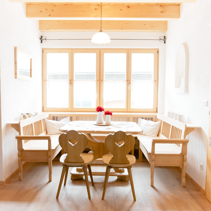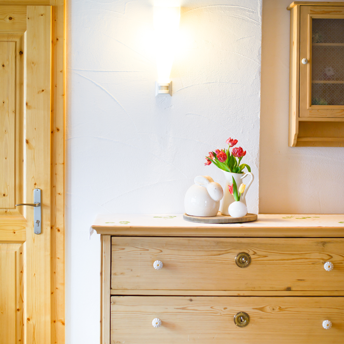 Der alte Kreuztisch stammt aus dem 16. Jhdt., einer Zeit, wo man noch mit Pferden durch die Lande zog. Dort am Tisch haben schon viele ihren Platz eingenommen, wahrscheinlich Holzknechte, Musikanten, Mägde und Bauersleut‘ mit ihren Kindern. Den Querbalken, der die 4 Holzfüße verbindet, nennt man im Volksmund ”Vergelts Gott“, weil man vor dem Essen die Knie darauf stützen konnte und gebetet hat. Zu alten Zeiten haben alle aus einer Schüssel gegessen – keine Sorge, du bekommst einen eigenen Teller! Vielleicht fragt man sich das Gleiche in 400 Jahren „Wer da wohl gesessen hat?“ Eines ist klar! Du warst auch dabei.